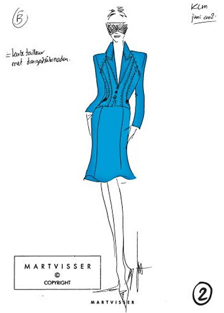 the finished products are nothing to do with fashion – they are corporate attire. ‘I see corporate uniforms as a company’s statement to the outside world. the wearer should feel comfortable in my creation, further strengthening the KLM image.’ visser says. ‘it is much harder to design corporate clothes than couture.’ the uniforms have to be comfortable and fit sizes 32 to 52 as well as being suitable for all seasons. although he was largely given a free reign, there were some stipulations. and one of these was that visser used the sam KLM trademark blue material.