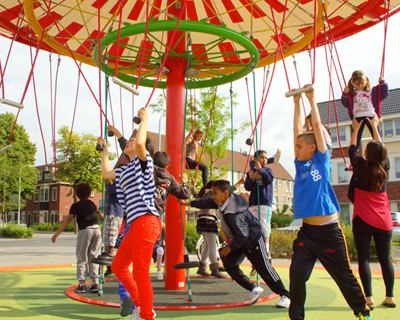 built using efficient materials that help highlight the project’s unique design, it is an interactive playground feature. the kinetic energy released by the children’s hanging from and turning on the ropes is captured via the carousel structure and stored in a battery in the ground below – this energy is then used to generate lighting in the evenings. the mechanism of energy production and lighting is as simple as a bike dynamo and the color of the lights also changes depending on how much energy has been generated by the children on any given day.