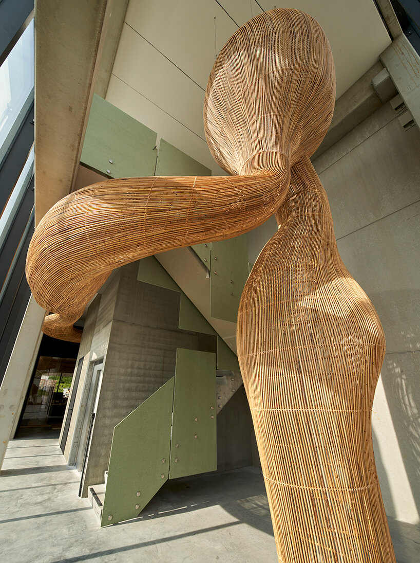 the rattan materials contrasts with the starkness of the existing space