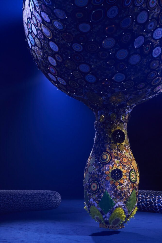 Artist Joana Vasconcelos sets the backdrop of Dior’s AW23 show in Paris with her kaleidoscopic fabric-filled installation ‘Valkyrie Miss Dior’. The epic, site-specific textile installation Vasconcelos infuses floral textiles inspired by the House’s archives.