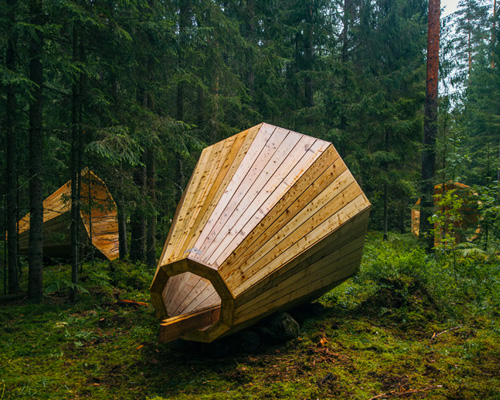 a forest clearing in estonia’s võru county has been reconsidered into a space of meditation, relaxation and community engagement through the installation of three giant wooden megaphones. interior architecture students at the estonian academy of arts have conceived the idea of a forest library near RMK’s pähni nature centre, where the quiet sounds of chirping birds and rustling leaves are amplified to surrounding site visitors.