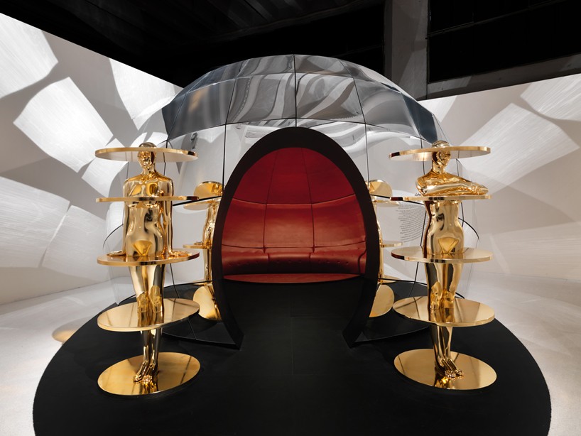 fabio novembre worked on the idea of a bedroom, integrating it into the most perfect and ancestral shape. the concept builds upon the form of an egg which represents a source of life and transformation. the outer layer, realized with almax—known for their expertise in mannequin and display design—is made of mirrored metal that conceals a warm intensely red leather room. italian furniture house natuzzi who specializes in leather and upholstery, partnered with novembre to realize the interior of the dome which is a complex puzzle of 120 pieces of red leather, all assembled by hand.