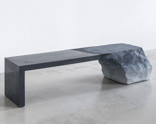 fernando mastrangelo‘s drift bench is part of his ‘FMS’ collection, which blurs the line between fine art and furniture design. the bench is made from sand and cement which creates a rugged yet refined surface. the brooklyn-based creative uses organic materials such as glass, salt, sugar, sand, and quartz, to create sculptural pieces that combines his minimalist aesthetic with high quality craftsmanship. the motivation behind mastrangelo’s work is to challenge our experience towards everyday objects, presenting itself as formal and functional through the use of commonplace materials. the collection can be used indoors and outdoors, with the colour and texture of the furniture blending harmoniously with nature, whilst acting as a stark sculptural object when used indoors. mastrangelo’s work is being presented at art genève from january 28-31, 2016; and during new york design week 2016 at collective design fair from may 4 -8, 2016.