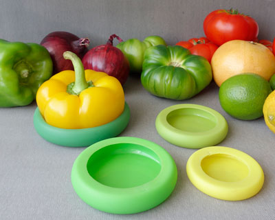 these are the key driving forces behind ‘food huggers‘ – a new way of preserving the freshness of leftover produce – by adrienne mcnicholas and michelle ivankovic. the product addresses the need to prolong the shelf life of our fruits and vegetables in the form of reusable 100% FDA silicone (BPA and phalate free) covers which can easily be popped over the remaining half of your apples, onions, peppers etc., creating a seal which locks in their natural juices and moisture. the upper edges of each ‘hugger’ snuggly wraps around your produce securing the lid in place and preventing it from air circulation which can cause food to spoil or dehydrate. dishwasher, microwave and freezer safe, they are available in four different sizes, to accommodate all shapes and sizes (from 1.5″ to 4″), the newest product added to the line-up is the ‘advocado hugger’ which is currently seeking funding on kickstarter.
