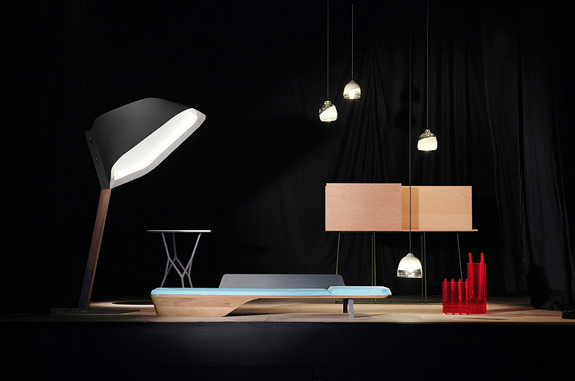 far left: floor lamp by no. 111, made of metal, wood, and LED stripping back right: desk by eric jourdan, made of wood and steel tubing