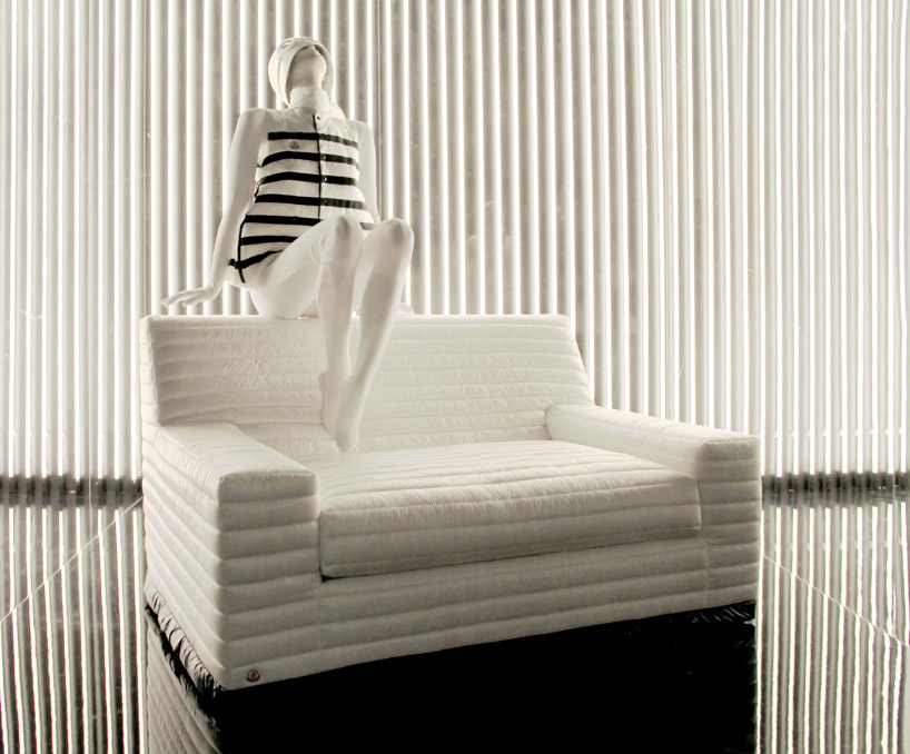fashion house moncler. the furniture piece transforms the quilted jacket, an iconic garment of the clothing brand, into a sofa.