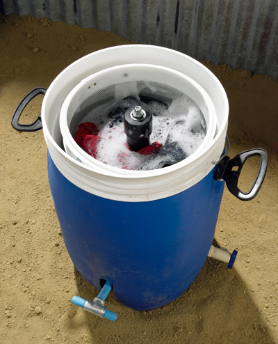product use: 1. place clothing inside ‘giradora’. 2. fill bucket with water, a couple inches above clothing. 3. add detergent. 4. the user sits on the lid of the appliance. 5. the user pumps the pedal with her foot, which agitates, cleans, rinses then spin-dries clothes. 6. a drain makes it easy to capture grey water in a tub for re-use.