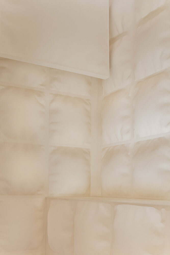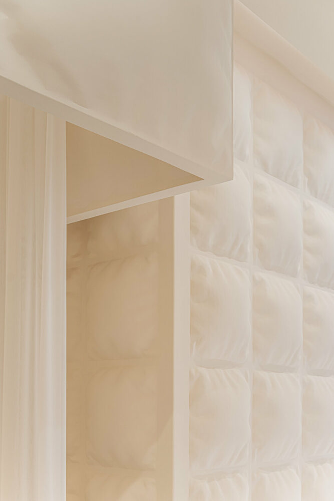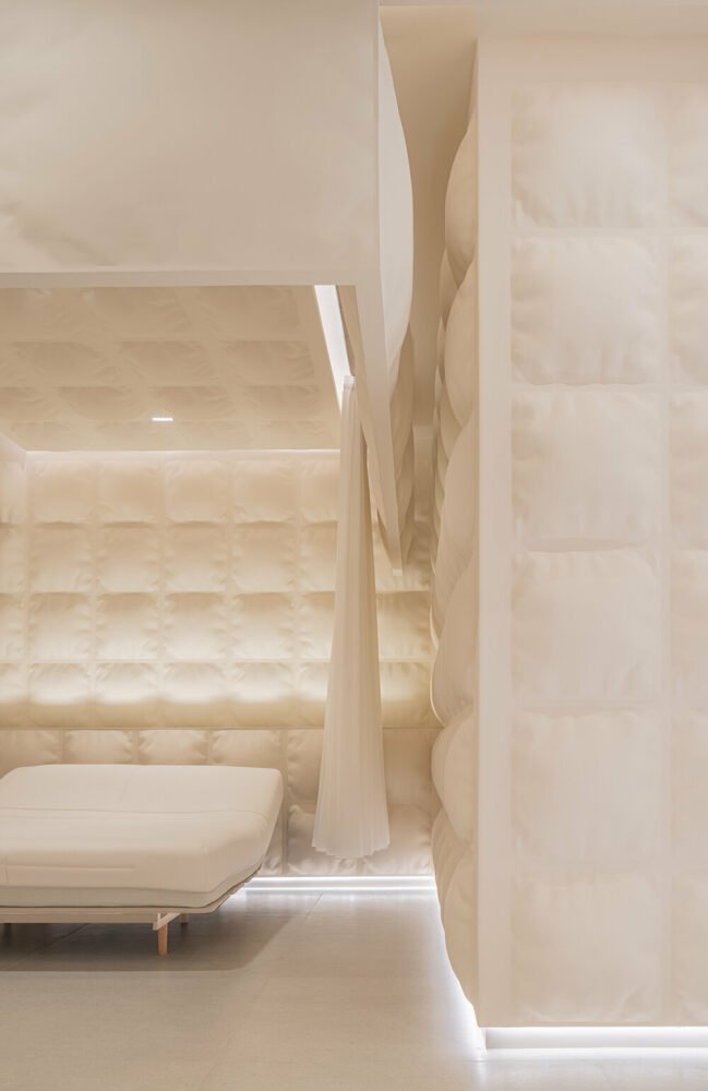 The LITO by Storeage store continuously uses the same element, a glass fiber-reinforced concrete pillow, which instills an instant calm that resonates throughout the space. Rather than mimicking a bedroom or home environment, the agency opts for a grid-like structure with a monochrome color palette that focuses the consumer’s attention on the product itself, the quality and feel of the technology inside, and the overall experience. Enhancing that experience, Storeage avoids any direct spotlights on the product and implements illumination in the form of hidden wall washers instead, programmed to dim in a slow rhythmic pattern of low/high luminosity.