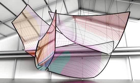 located at the entrance of the designer’s lounge, the structure will extend over 80 square metres and reach over 7 metres in height. using technology from the sailing and shipbuilding/nautical industry in which carbon and aramid fibres are compressed between transparent sheets of mylar to make strong, lightweight and transparent sails less than 1mm thick, lynn has created swarovski crystal-encrusted suspended sails that are moulded and curved into billowing shapes which overlap and intersect.