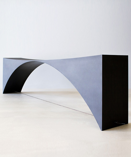 the bench results from a personal search for the essence of things and attempting to get to the heart of the matter by deconstructing an image, pushing the material to the limit, and restoring it with minimum intervention. by walking on a thin line, the aim is to create a small shift of perception, making the viewer question the object its effective potential. the main structure of the seating element is made out of several layers of lacquered MDF, the central part having a minimum thickness of three millimeters. in order to make a structural piece, a hot-rolled steel arch is paired with the MDF. the darkened stainless steel cable provides overall stability, avoiding any possible movement of the arch when pressure is applied.