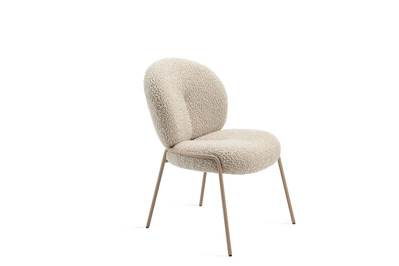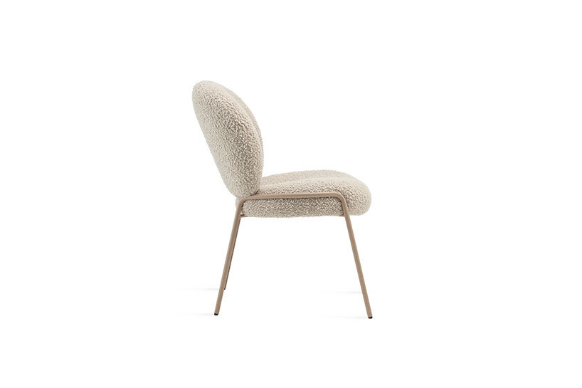the seat cushion nestles into a frame made of powder-coated tubular steel. the wool bouclé fabric nimbus by dedar was chosen for the upholstery