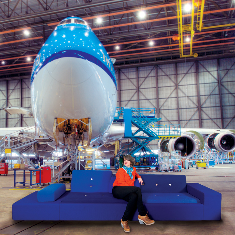 hella jongerius with erik varwijk, managing director of KLM on the designer’s ‘Poldersofa’ in the KLM-hangar image © KLM