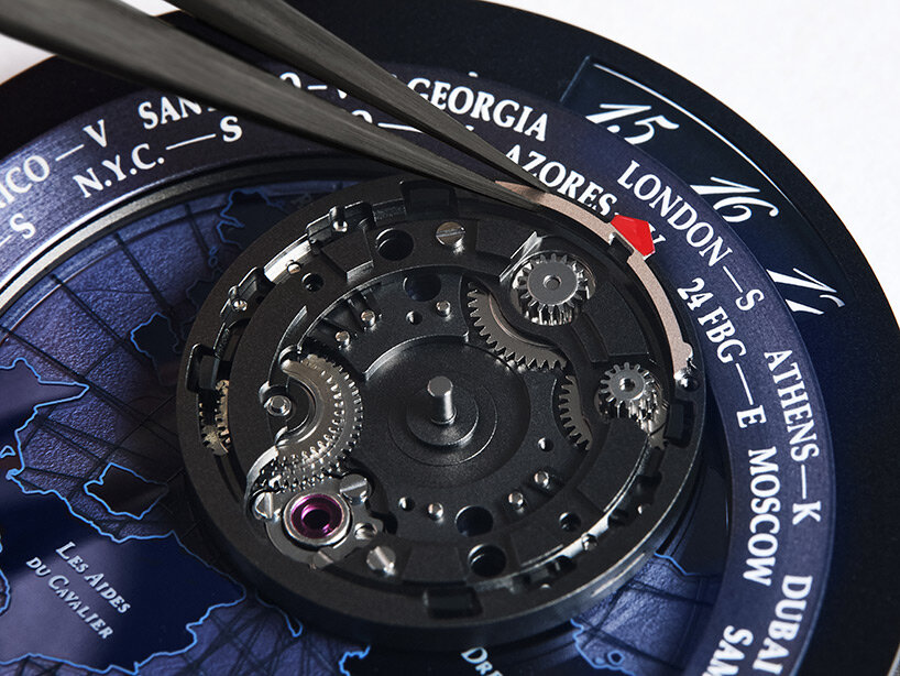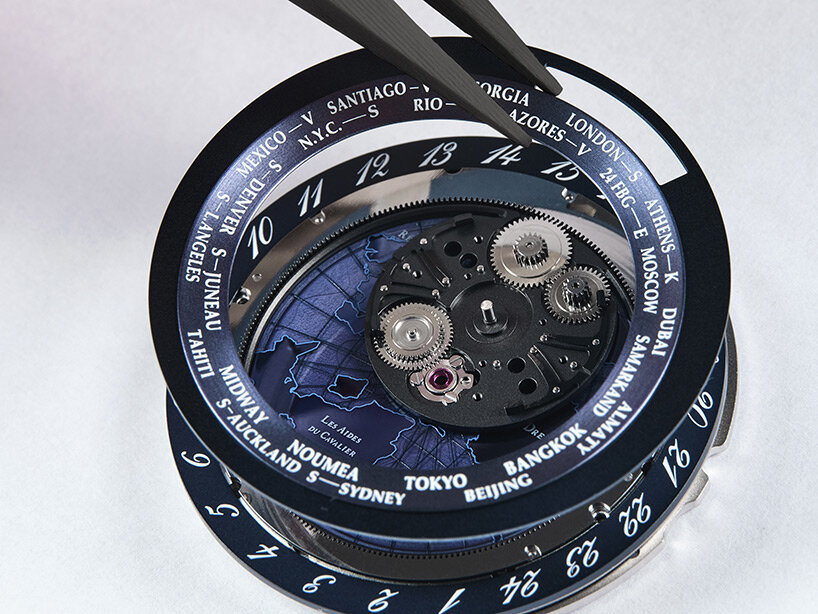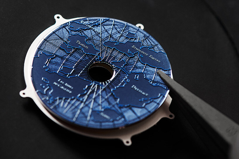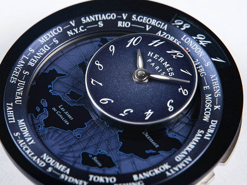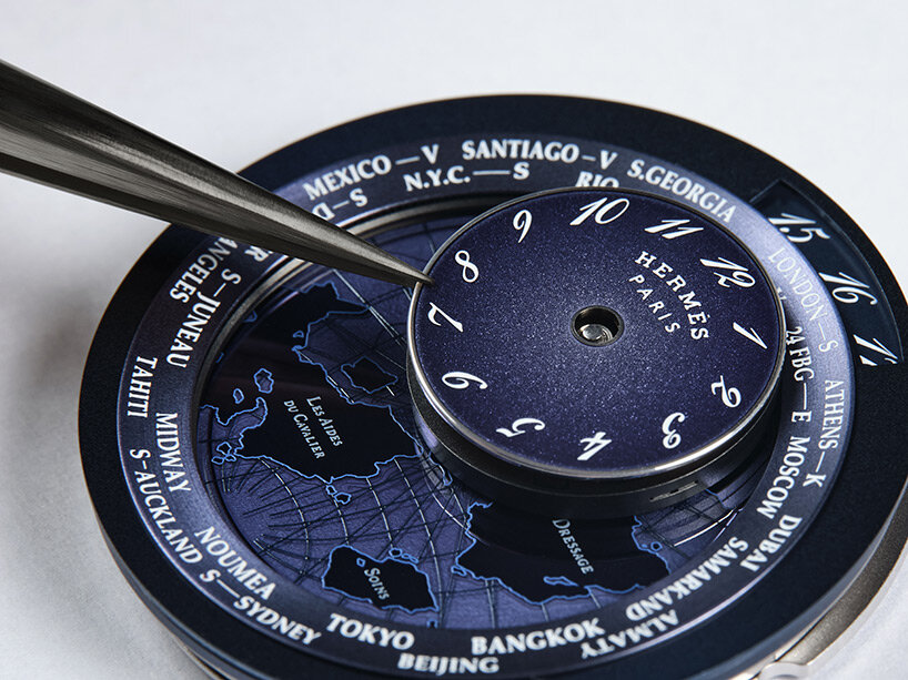 ‘For me it’s important to have a watch that tells a story, so with Arceau Le Temps Voyageur we wanted to bring together two of Hermès’ pillars: traveling and horses,’ Philippe Delhotal, creative director of Hermès Horloger, told designboom. ‘We started playing with the idea of the satellite traveling around the watch. But the creation wasn’t finished because when you talk of travel, most of the time we’re talking about this world. At Hermès we like to make things different, and we were lucky to discover a map designed in 2016 for Hermès by Jérôme Colliard and thought, this is exactly what we need. It was imaginary, it presented a dream, and it was equestrian.’