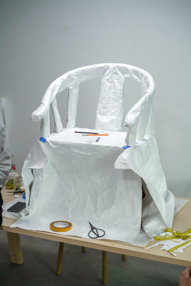 YUUE (see more here) chose a Ming-style chair and a traditional Chinese porcelain vase as cultural symbols and wrapped them tightly in a tailored protective suit. For Xinyu, the project hits close to home; as a German citizen of Chinese descent, he’s unable to visit his family throughout the pandemic. Homesickness and resentment therefore started feeding onto each other, pushing him to translate these emotions into an absurd design.