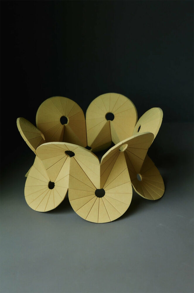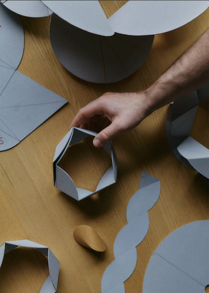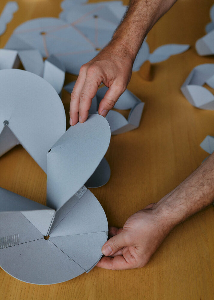 At atelier oï, we often begin our creative process with an encounter with the material,’ shares studio co-founder Aurel Aebi.Our goal was to find a way to make the sustainable material speak in a new way.‘ The encounter occurred at the Impact Acoustic offices and workshops, where the studio fully familiarized itself with the ARCHISONIC® Felt panels. Through cutting, milling, and drilling, the designers pushed the material’s limits, testing its stiffness and flatness before giving its initially rigid anatomy a whole new character. Impact Acoustic co-founder Sven Erni elaborates on the production process, stating that the team used a distinctive cutting technique at specific angles before skillfully folding the two-dimensional panels into three-dimensional, modular entities.