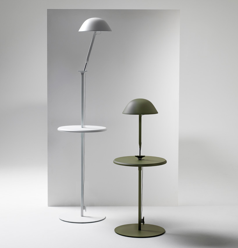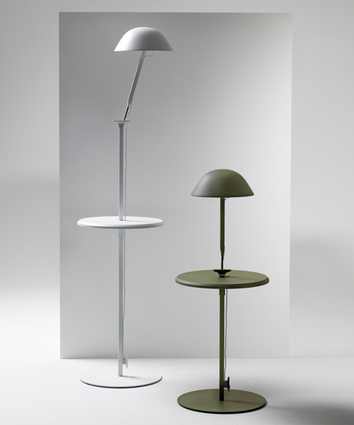the ‘w103s’ series was originally conceived as a table lamp. taking on the aesthetic of traditional tool machine lighting, it is defined by a silhouette that brings to mind the image of a small umbrella. sempé then transposed the design into a pendant version which could be composed as single or multiple hanging shades, suspended or attached on a rail for linear arrangements or polygonal configurations. now, sempé brings forth a modular floor version to complete the ‘w103’ range. the standing edition comes with interchangeable table elements providing an extra surface to place a book, or cup of tea; and has a vertical shaft that can be moved up and down so that users can easily adjust the height of the lighting according to their needs. another bonus is that more than one lamp shade can screwed into the top at a straight or tilted position, offering a controllable brilliance; and components of various colors can be mixed and matched to create a unique lighting experience. inga sempe wastberg stockholm furniture light fair designboom