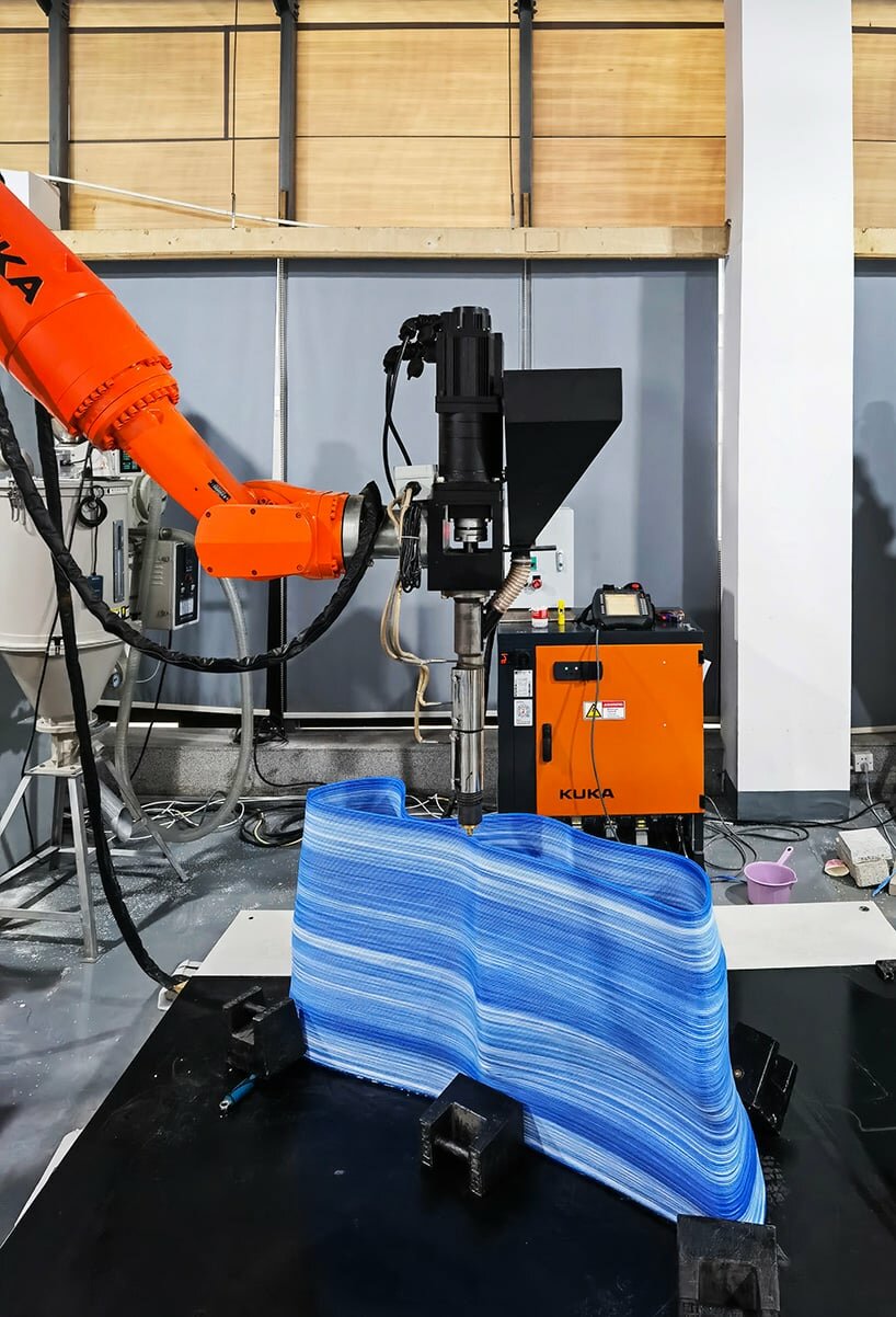 Organized by Hao Hua of SEU and Benjamin Dillenburger at ETH Zurich, the installation integrates material ecology and robotic 3D printing. Bio-degradable thermoplastic Ingeo PLA has been used to print the form using a pellet extruder, meanwhile a mixture of thermoplastics fed into a robotic printer gives shape to the gradient surface with varying colors and textures. The integration of advanced technologies of additive manufacturing and programmable electronics further make Glowscape a live, interactive installation engages in a continual loop of motion. ‘Glowscape starts communication with people by invoking collective memory of traditional patterns,’ notes Hao Hua.