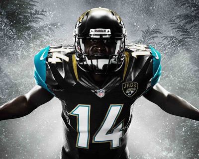 DB: what was the starting point or brief for the uniform design process?TVH: the first source of inspiration for the new uniform came from the city of jacksonville itself, the spirit of the american dream that’s highly evident there – in the people of the city, the fans, the military fly-over before every game and its connection to the US navy. secondly was the pioneering spirit of both bill bowerman and the JAGS new owner shad khan, innovators such as them don’t look backwards they look forwards – they want to push things forward and thats what we wanted to do with this new uniform. thirdly, and this is perhaps the most obvious, was the jaguar – many of the players want to embody the spirit of this animal when they come out onto the field – the jaguar comes out from the shadows and attacks. the new logo is fierce, a jaguar on the hunt and we wanted to carry that through with fast lines and sharp edges.