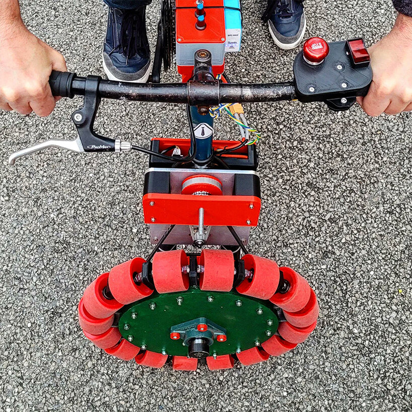 For this project, the designer built and set a self-made giant Omni-wheel on the front of a bicycle, while with some clever electronics, he managed to control the wheel so as to be able to ride the vehicle.