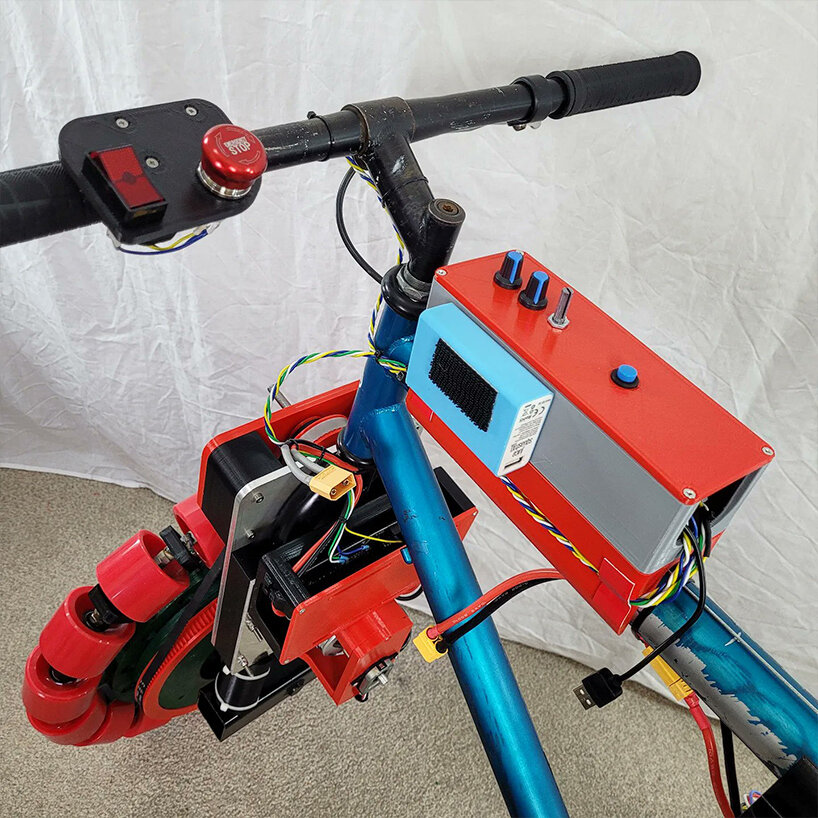 After some practicing, he eventually managed to spin around with the balancing mode turned on and then switched it off and continued driving like a normal bike — stunningly without putting his feet on the ground. how to build & ride a bike with a giant omni-front-wheelall images by James Bruton