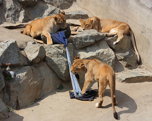 a japanese fashion label has partnered with the kamine zoo in hitachi city for the creation of a denim collection, whose ‘worn-out’ style is actually created by the tigers, lions and bears which live at the zoo. workers at the wildlife park wrapped long sheets of denim material around car tires and bundled them in small balls, which they then placed into the habitats where the creatures reside. biting, tearing and scratching at their new fabric toys, the fearsome beasts bear their marks on the blue textiles, scarring and shredding them into tattered segments. finally, the ‘zoo jeans‘ are sewn together from the semi-eaten pieces, forming a completely singular pair of legwear. the collection will be auctioned off to encourage the environmental protection of animals, and the revenues will be donated to both the zoo and the world wildlife fund.