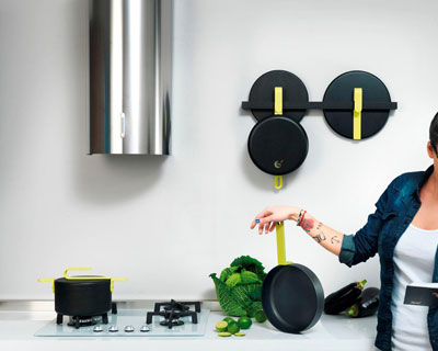 presented at the 2013 ambiente fair in frankfurt, the ‘hook’ collection by karim rashid for italian kitchenware company TVSintroduces a series of colorful pots and pans whose lids – which literally feature hooks – allow users to hang their cookwarefor convenient storage. the range of non-stick tools capture the liveliness found in cooking environments.