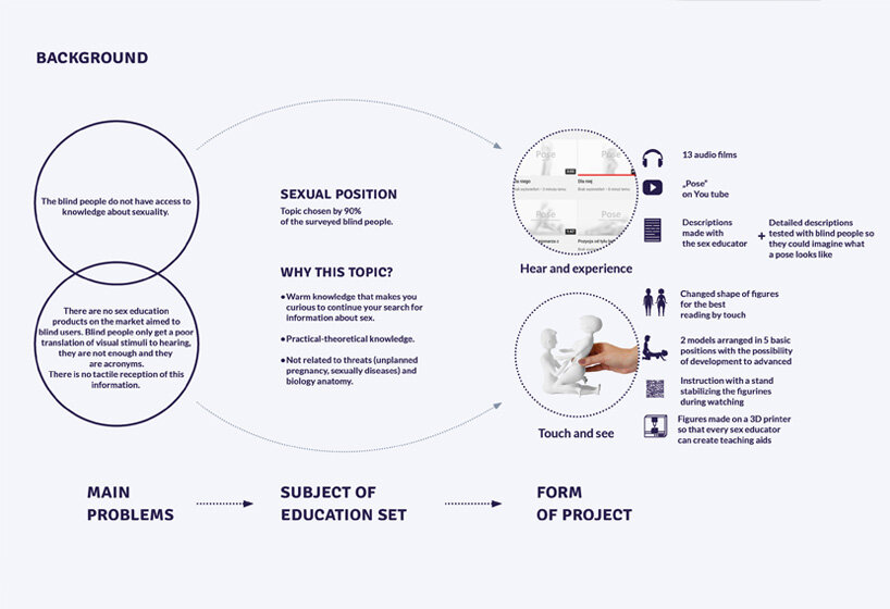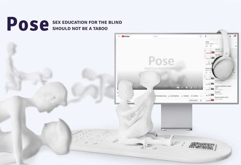 ‘Pose’ is an educational sex set for the blind created by Polish designer Karolina Kruszewska in collaboration with sex educator Dr. Dagną Kocur. Developed as part of Kruszewska’s master’s thesis at the Academy of Fine Arts in Katowice, the project offers extensive knowledge about sex positions and identifying anatomical features to help guide the visually impaired in intimate acts. This information is released as 13 audio films on YouTube and 3D-printed figurines depicting the five basic sex positions.