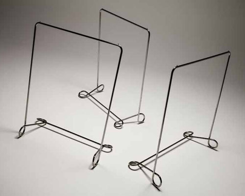 reminiscent of a traditional ‘chieno-wa’ or ‘puzzle ring’, the bending hanger rack by japanese designer keisuke fujiwara was developed to display products in his shop designs for ‘pleats please issey miyake’. constructed out of a 19 mm diameter stainless steel pipe, the piece is bended into a free standing form. the curving structure can easily be stacked, even though it features twisted rack legs. the rounded base helps to form the structural support, ensuring its stability to hang items.