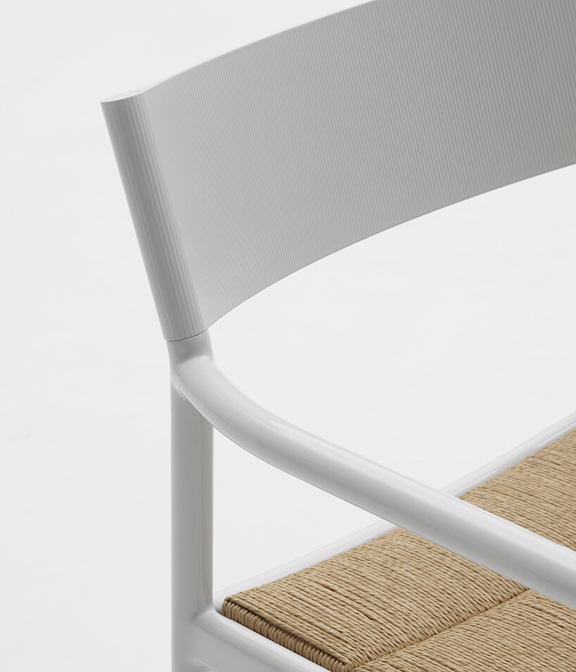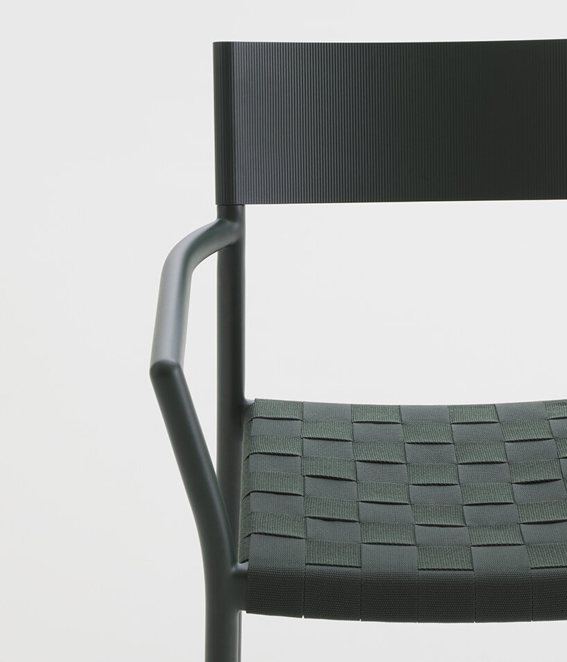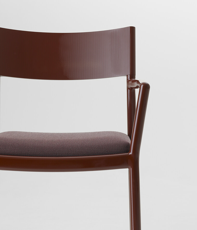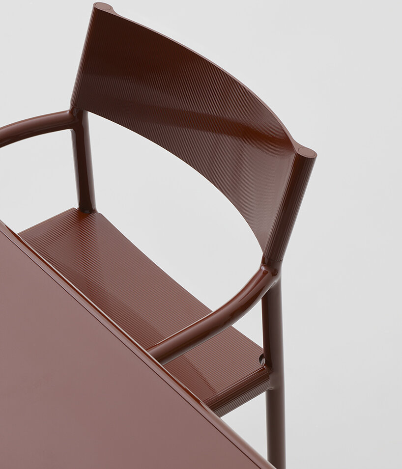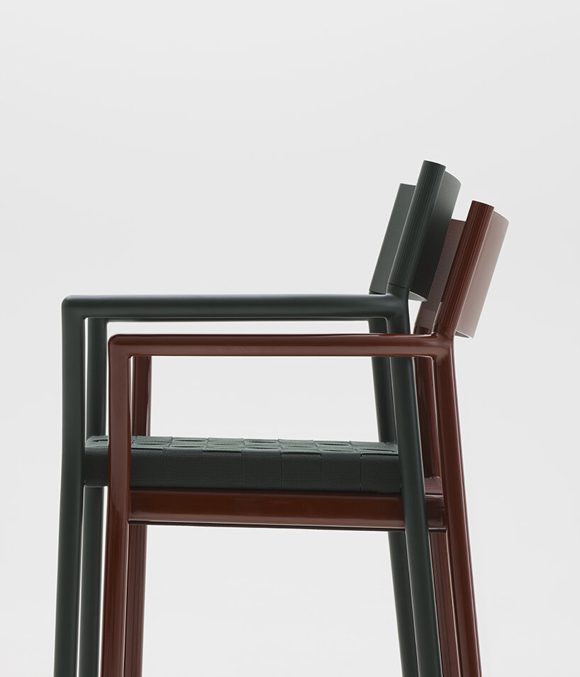 the Passage chair is composed of a soft and fluid aluminium structure, where slides over a backrest made from a single piece of extruded aluminium