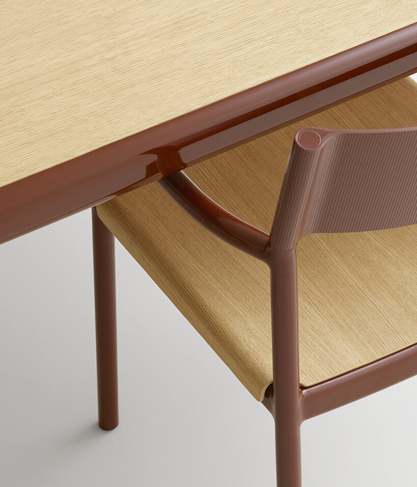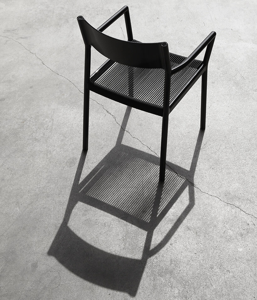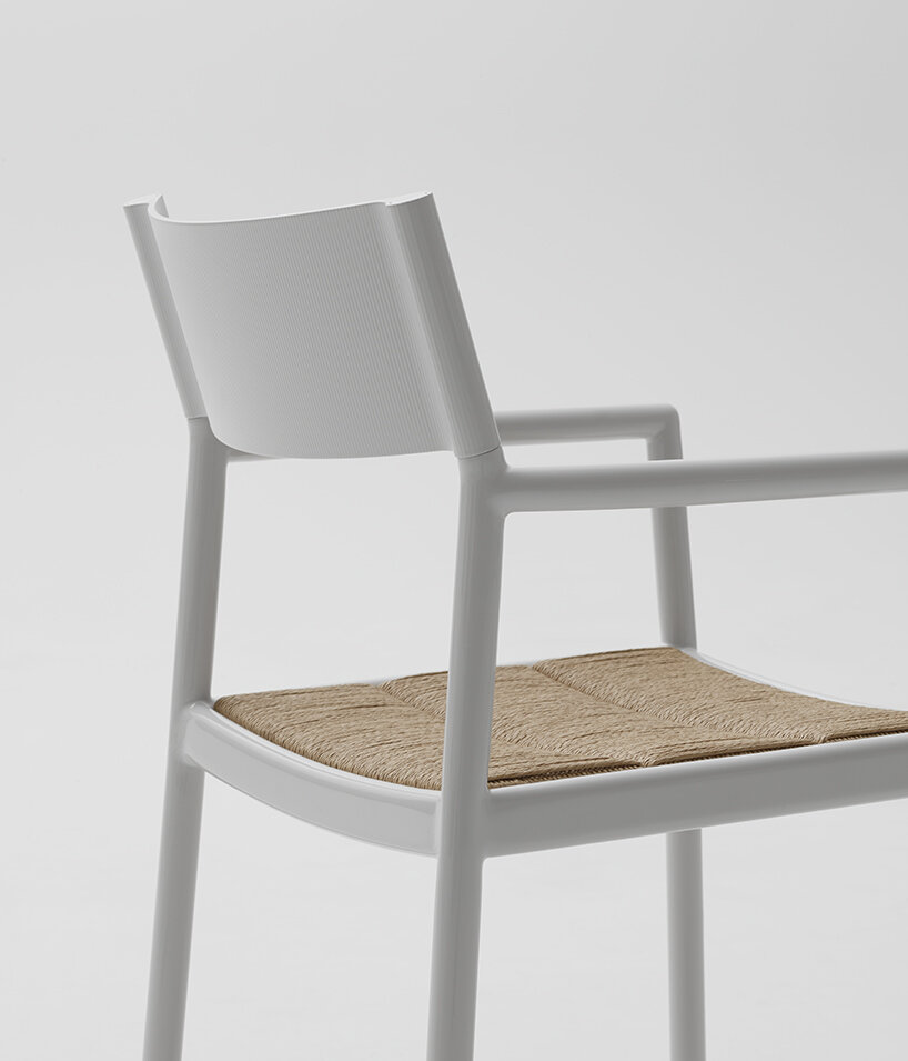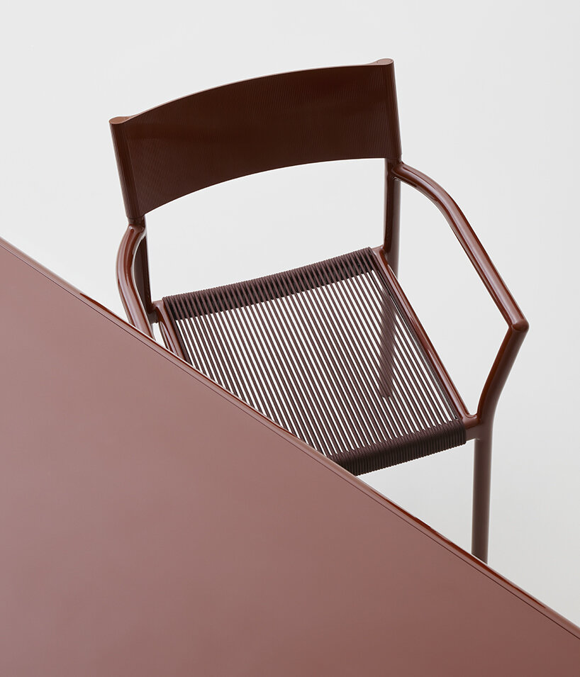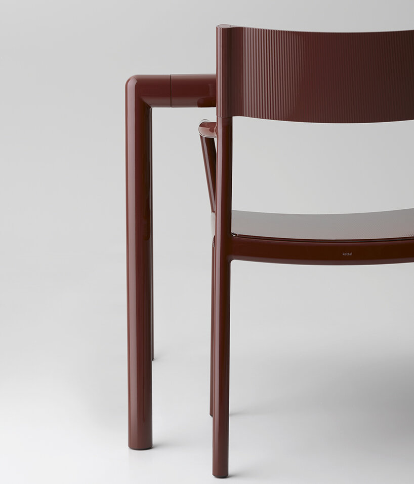 the Passage chair is composed of a soft and fluid aluminium structure, where slides over a backrest made from a single piece of extruded aluminium