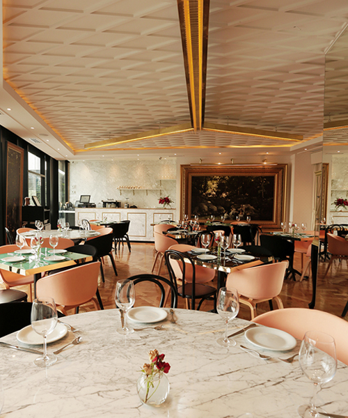 the purpose behind kob&co‘s macadam project is to recreate the atmosphere of a museum that tells its concept through paintings and settings of the old masters who were once inspired by the famous story of adam and eve. this essence has been recreated in a contemporary atmosphere, accentuating and defining the space with paintings that expose the pure and innocent as well as the forbidden and the sexual — marking day and night with the opposites of this story that define the natural beauty of eden and the sensuality of the forbidden. warm tones and classical features (ceiling, painting frames, gold and pastel) are strongly present across the restaurant, highlighting the museum quality of the design.