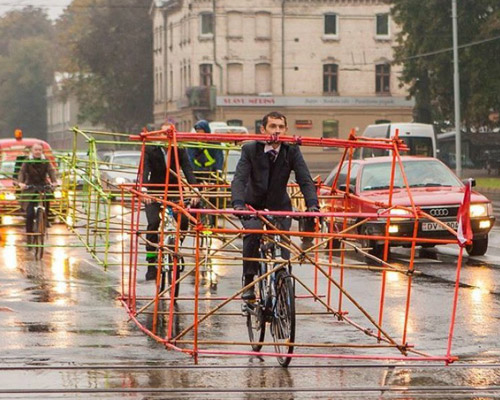 during this year’s european week of sustainable mobility, a branch of latvian cyclists part of the let’s bike it community staged a creative protest, which effectively — and cleverly — showed that cars with single occupants take up way too much space. the streets of riga were lined with hand-crafted constructions of full-scale car frames, made to sit on the shoulders of the bike rider. bamboo-like rods tethered together created the skeleton of a vehicle-sized structure, while bright colored paint ensured their visibility on the road. the wearable units extend far beyond the width of an individual cyclist — a truly representative and definite illustration of the difference in scale from driver to bike rider.
