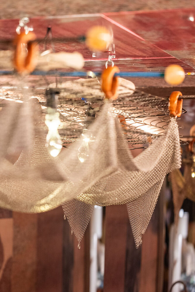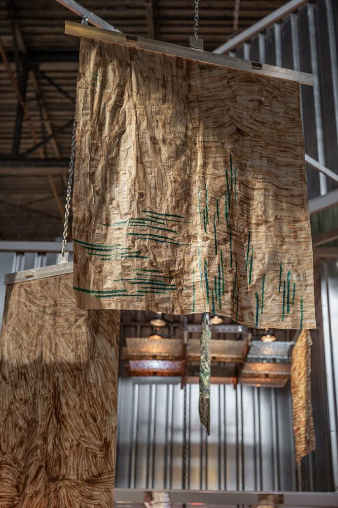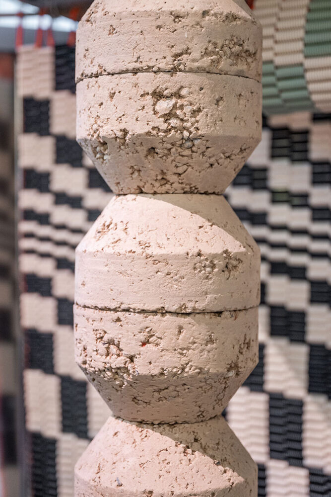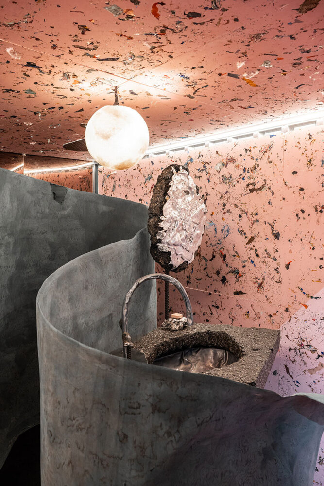 plastic wall coverings fashioned from discarded materials, and papier-mâché partitions created on-site