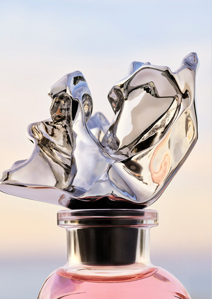 taking shape as a silver-colored sheet that dances in the wind, the cap adds an ethereal touch to the bottle. the form of the flacon is a tiny-scaled revival of the fondation louis vuitton structure, designed by frank gehry; twelve expansive panes made of 3,600 tiles of glass give the design the impression of colliding sails sweeping in the wind.