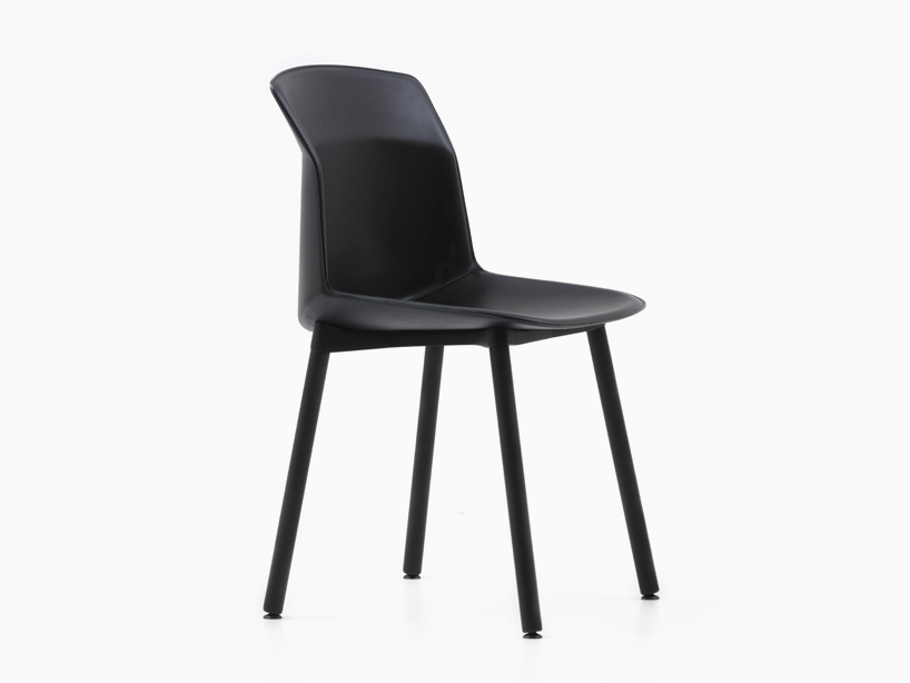 grey felt versions of the ‘motek’ chair with polished aluminium legs (left), and painted black cast aluminium legs (right)