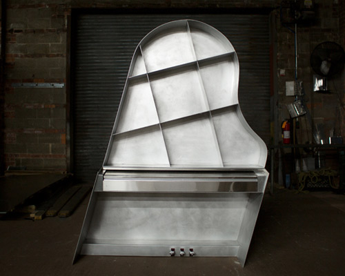 smoothly finished aluminum with a wrapped exterior of walnut veneer compose the functional ‘leaning piano’ sculpture by new york designer maciej markowicz for wiczny. the hybrid piano is able to accommodate a full 88 key yamaha arius digital board, as well as provide shelving for various music texts and items. metal and wood contrast visually and in tactility, aiding the centrifugal force that moves through the shape.
