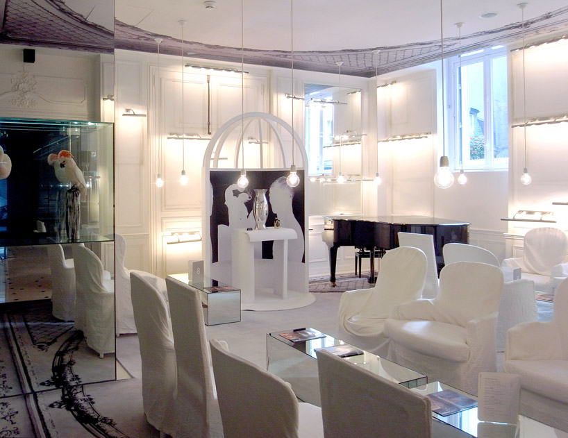 fragments of wainscotting, different easy chairs are turned into single sitting units through all-enwrapping white canapés houssés (right). oversized mirror over bed reflects entire room, surrounded by lamps which are similar to those of dressing rooms in theaters and for catwalks (left). image © designboom