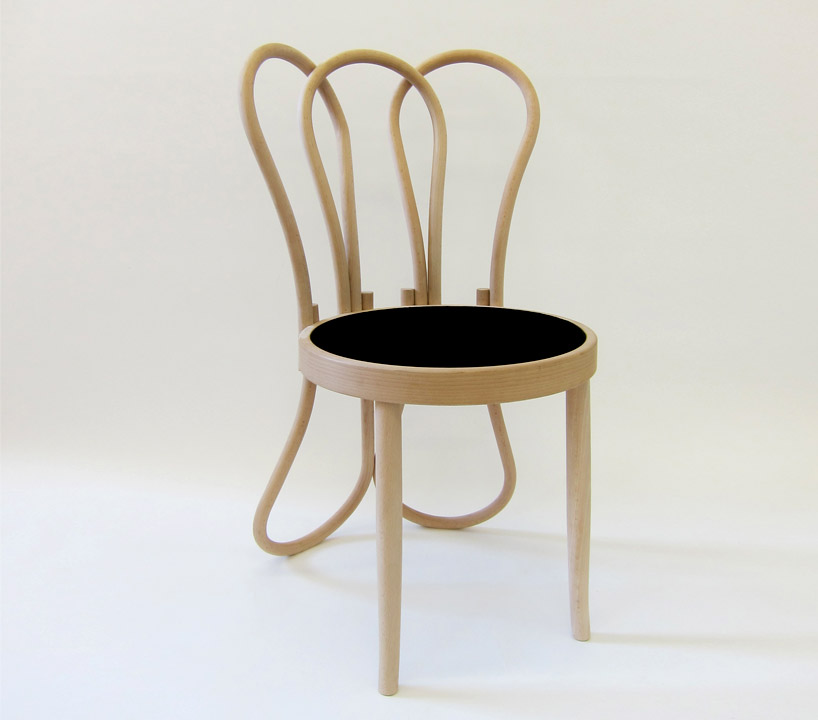 which he reworked to create the seating object. five beech wood branches are curved – three of which are layered, forming the back,