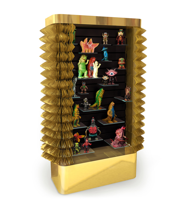 triangles of technical fabric are arranged to create a curtain wall which wraps around the cabinet