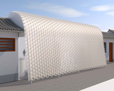 the overall tiling system not only reflects the architecture of the hutong area, but also stands to protect users from the sun and rain–deflecting both of these elements. in addition, the material composition from which the tiles are made, resist the extreme temperatures which the city experiences between the summer and winter months.