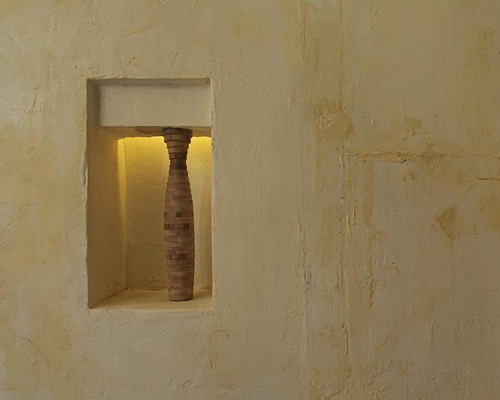 michele de lucchi takes the architectural support of a pillar to create a site specific work at fondazione VOLUME! in rome. invited to interpret the old glassworks volume, the italian designer has carved out niches and recessed corners into the walls of the gallery to establish miniature platforms, occupying these cavities with columns, which are similar to that of artist giorgio morandi’s bottles – which appear different every time you look at them. de lucchi’s pillars are assembled by a construction of walnut wood slices, slightly varying in proportion between the shaft and capital, plinth and protrusion. through the implementation of these constructions, he explores the evolution of structure through these imaginary landscapes, offering small, pure, complete works of architecture. the show runs until february 15, 2013.