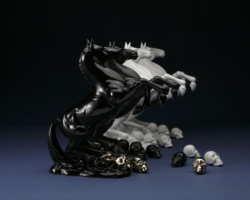 hong kong-based monica tsang designs has created ‘the victory’ sculpture in celebration of the chinese year of the horse. the project was based on the image of a steed and exploring ideas of death and creation. the horse is cast in a rearing position with its front legs raised in an effort to express that there are different interpretations as to what ‘victory’ means for each individual. small skulls lie at the base, aiming to introduce amusement in the midst of solemnness and contempt, curiosity and fear, sublimity and chaos.