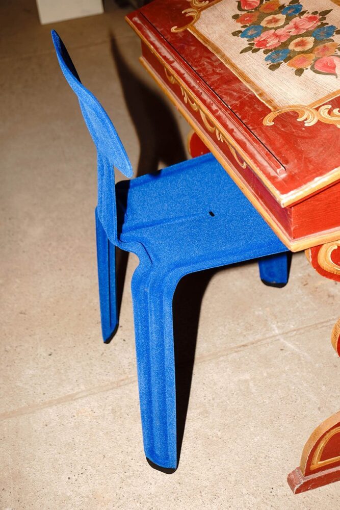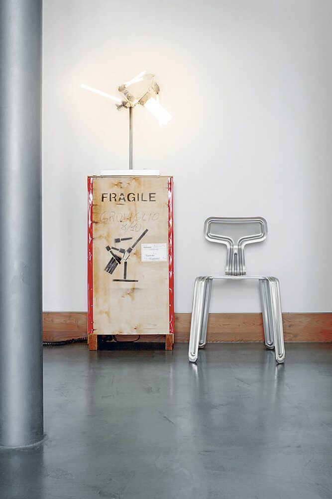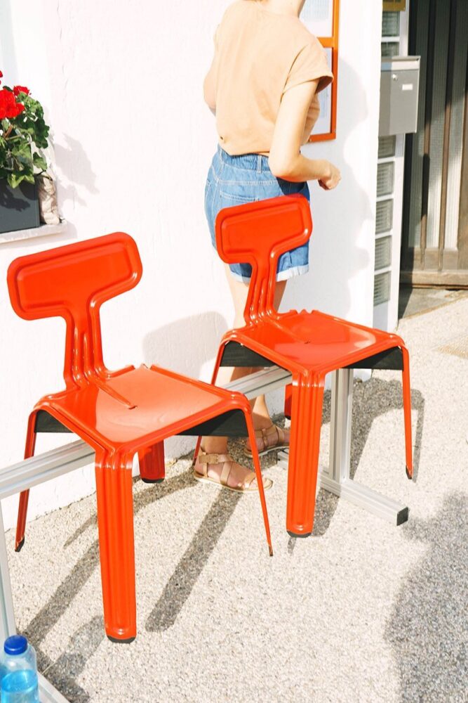 no rivets, screws, hooks or eyelets are needed to make the pressed chair – an aluminium sheet is simply pressed into shape. first, the contour is cut from a 2.5 mm thin piece of aluminium. in the second step, the circumferential curvatures and indentations are pressed into the material at a manufacturer of car chassis. and then the legs and backrest are moulded to the correct angle. the chair’s outstanding stability and characteristic appearance are owed to this unique construction. the jubilee year is celebrated with a homage to eleven unconventional custom-made models, which demonstrate just how flexibly the iconic piece can be used. whether the ski hill, skate park or swimming pool: the pressed chair always makes a fine impression and is the ideal companion.