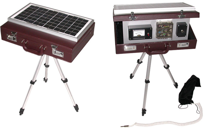 (left) solar panel back (right) contents of suitcase