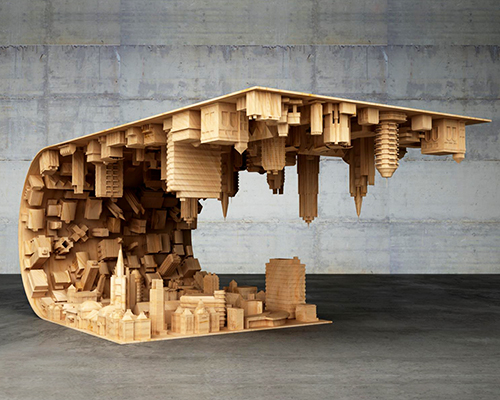 informed by the hit movie, cyprus based designer stelios mousarris has realized the ‘wave city’ coffee table that bends a landscape of buildings in half, using the overlapping surface as the tabletop. made from wood, steel and 3D printing technology, the piece illustrates an urban sidewalk scattered with skyscrapers that seemingly lifts into the air and finally folds back onto itself in a single, continuous curve. a series of meticulously carved buildings add a sense of realism to the otherwise surreal design object, which carefully balances on the lower section of the street.