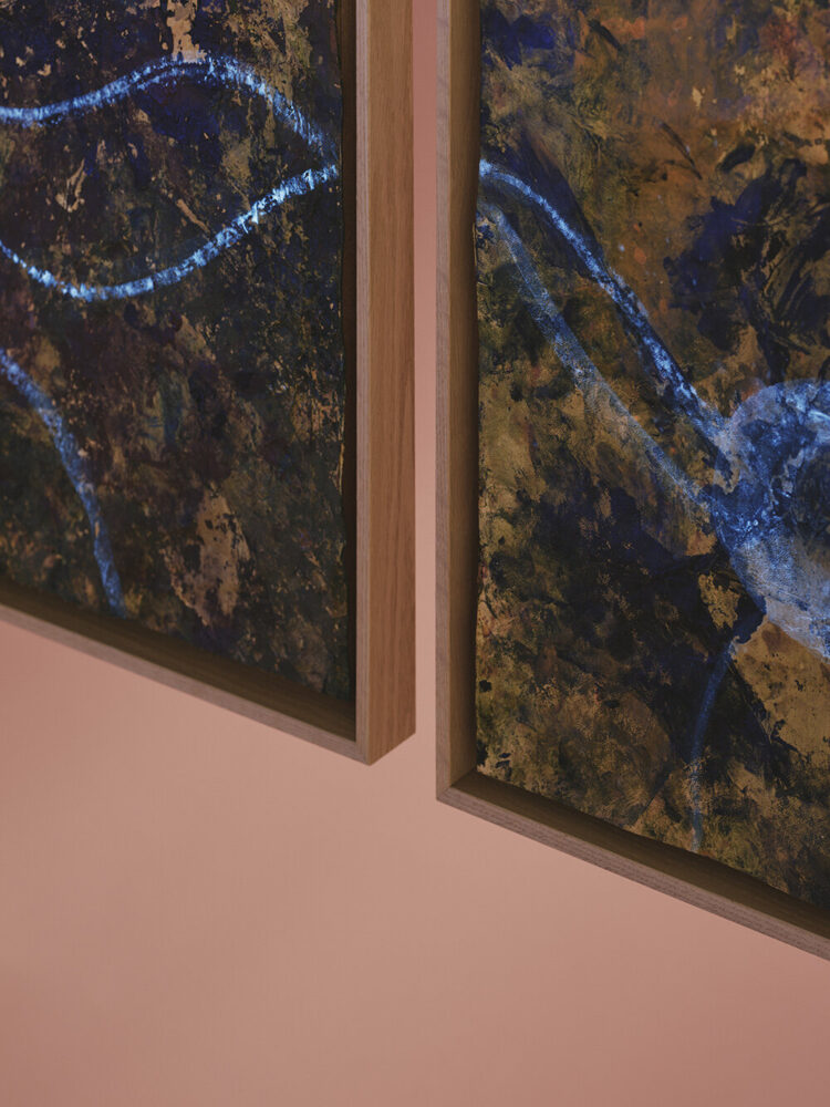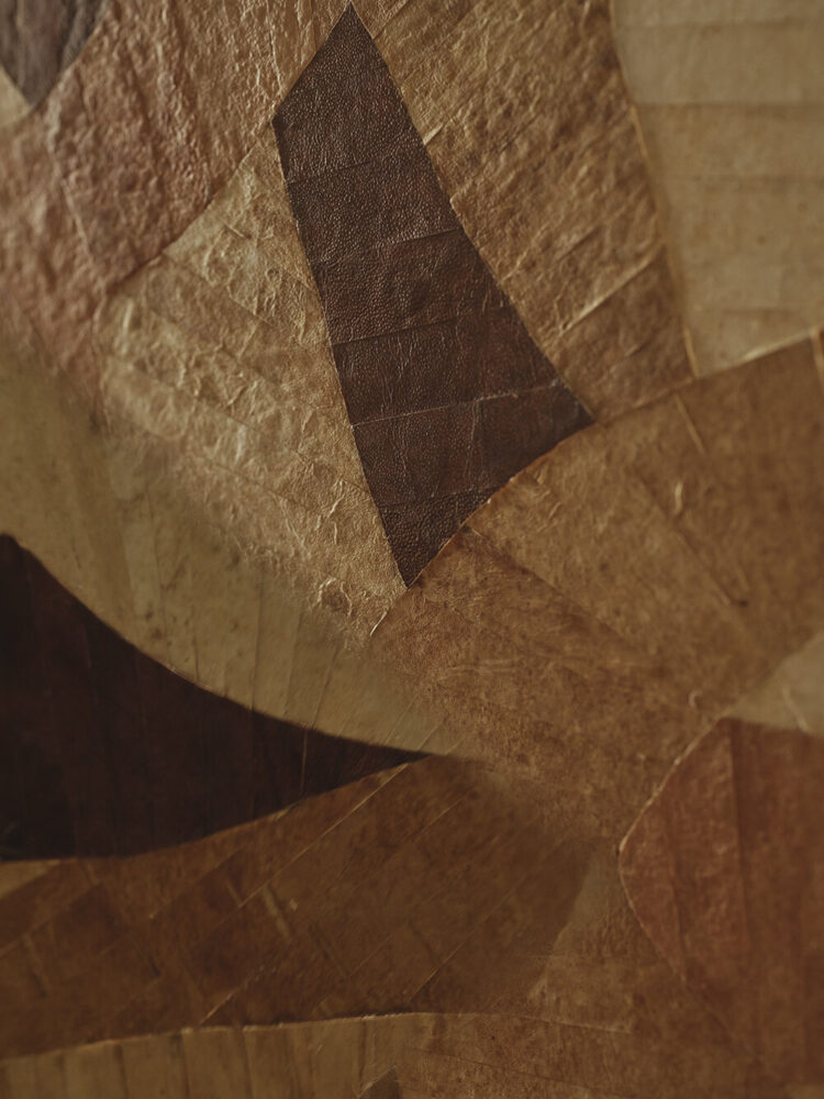 Last but not least, visual artist and photographer Sarah Valente has created a monumental fresco using ten sheets of Reishi™ that have been painted, rubbed, soaked, and folded. Valente’s non-figurative work, dubbed Magic Ancestors, is inspired by motifs borrowed from the forest’s flora and fauna. Ultraviolet light unearths a second layer to her work: in the darkness, one can find a luminescent and enchanting network of mycelium. Valente’s subject is the richness of nature. She is fascinated by humanity’s connection with the forest, its spiritual implications, and the role of plants in the evolution of our species. Her visuals capture the beauty of the jungle, birds, beehives, and the Amazon.