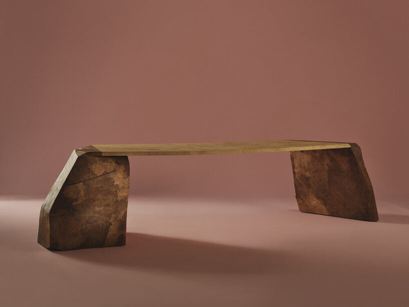 Moving on to Undergrowth, a desk by artisan Anna Le Corno, its organic form evokes rough-hewn logs, ax-cut trunks, and sharpened shingles. Built around taut lines, Farouche combined two natural materials whose beauty is derived from the imperfections and accidents inherent in their development: a Reishi™ sheathing and myrtle burr veneer. Trained as an architect, Le Corno perfected her cabinetmaking skills at the École Boulle, where she discovered laser cutting. She has taken an innovative look at marquetry, constantly experimenting with new techniques and freely mixing wood species and leather into her craft. Whether assembling wall panels, headboards or sideboard, she undersigns her designs with her trademark, Farouche–wild, rabid, fierce.