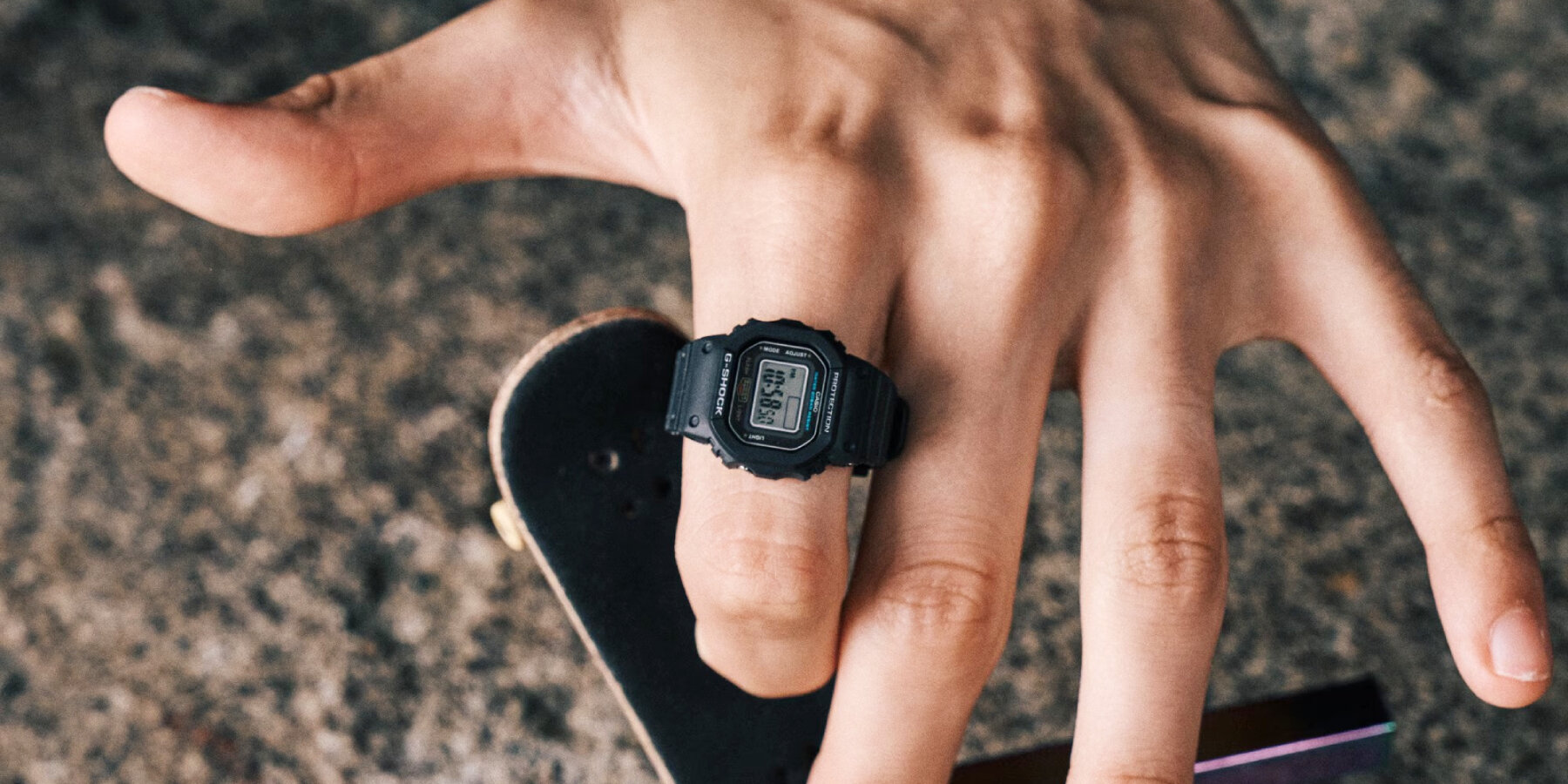 Casio continues its series of functional watch rings with the release of the downsized G-SHOCK Nano made of bio-based resin. A miniature model of the DW-5600 digital watch, it reproduces the shape and functions of the full-size G-SHOCK at about one-tenth of its scale. It is designed to fit on a finger like a ring, just like the first functional watch ring of Casio following its toy version.