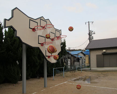 everyone is a victor with the ‘no one wins – multibasket’ backboard. the permanent installation that debuted at the 2013 setouchi triennale, is a whimsical backboard concept by berlin- and barcelona-based studio llbot & pons where local teshima island residents can shoot more than just a couple of hoops. hosting six nets, all positioned at various heights, players must use their own imagination to make-up new rules for the classic court sport.