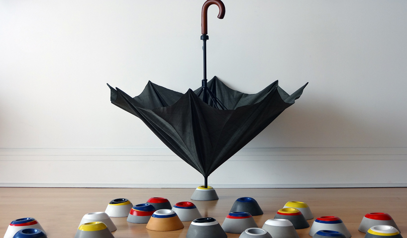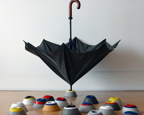 ‘catch my drip’ is a series of creative, concrete stands for dripping umbrellas. any frequent umbrella user is accustomed to the inescapable challenge of finding a place to store it, especially when it’s dripping wet. ‘catch my drip’ takes up practically no space, at 3.5” high X 6.5” diameter, the piece can be placed basically anywhere.